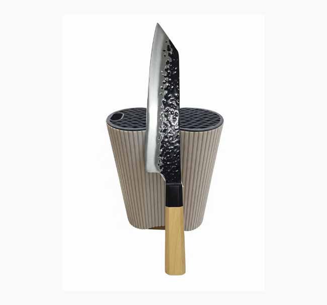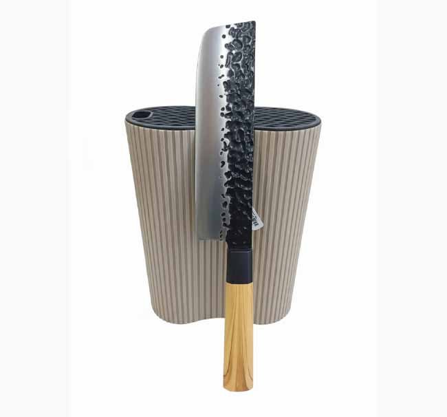 - تصميم مطروق (Dimpled/Hammered Design): تتميز الشفرات بتصميم مطروق عصري لا يمنحها شكلاً جذاباً فحسب، بل يعمل أيضاً على منع التصاق الأطعمة بالشفرة أثناء التقطيع (مثل شرائح الخضار الرقيقة).