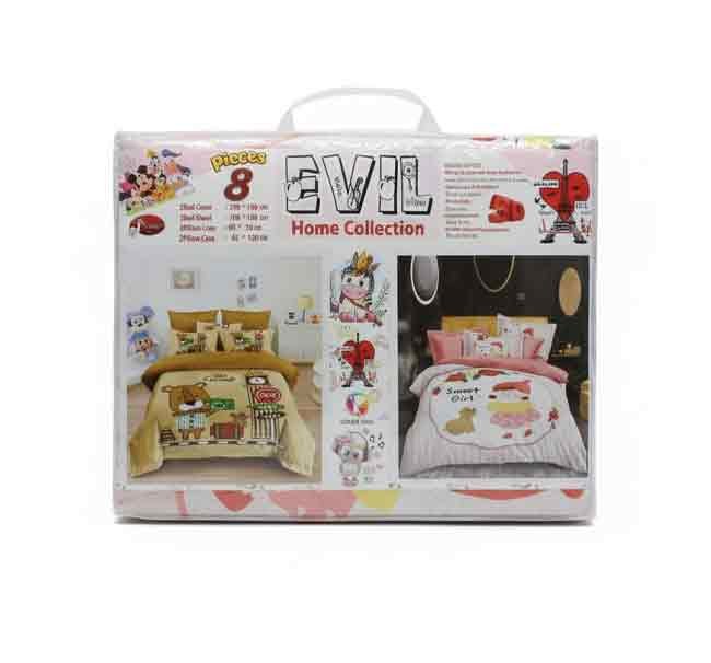 اجعل غرفة نومك لوحة فنية عصرية مع طقم المفرش الكامل من إيفل (EVIL Home Collection). هذا الطقم لا يوفر فقط الأناقة المميزة التي يطمح إليها الشباب والأزواج، بل يضمن أيضاً تغطية شاملة لسريرك الكبير بـ 8 قطع متناسقة وعملية.