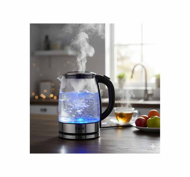 أكبر سعة وأشيك تصميم! غلاية “فرست” الزجاجية بسعة 2.5 لتر هي المنقذ في العزومات والمساحات الكبيرة. استمتعي بمشاهدة غليان المياه مع الإضاءة الزرقاء الساحرة في جسم زجاجي صحي ومقاوم للحرارة، لضمان مياه نقية وشكل عصري لمطبخك.